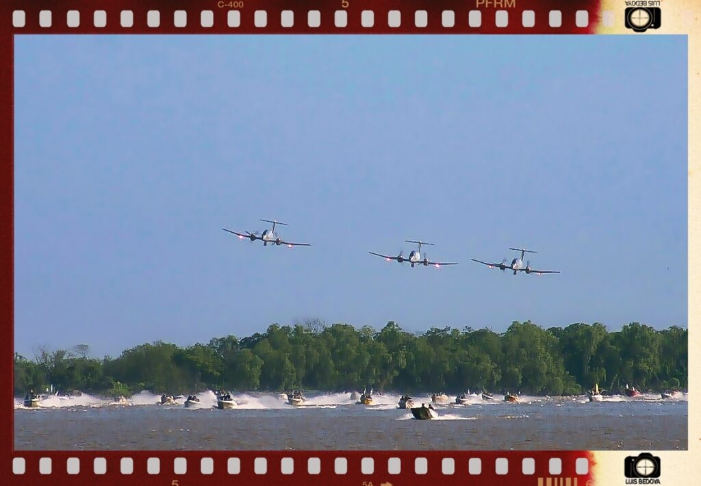 Largada de lanchas en el Torneo Argentino de Pesca del Surubรญ de la ciudad de Reconquista, acompaรฑado de las glorias de nuestra Fuerza Aรฉrea, pertenecientes a la III Brigada Aรฉrea con asiento en esa ciudad santafesina.